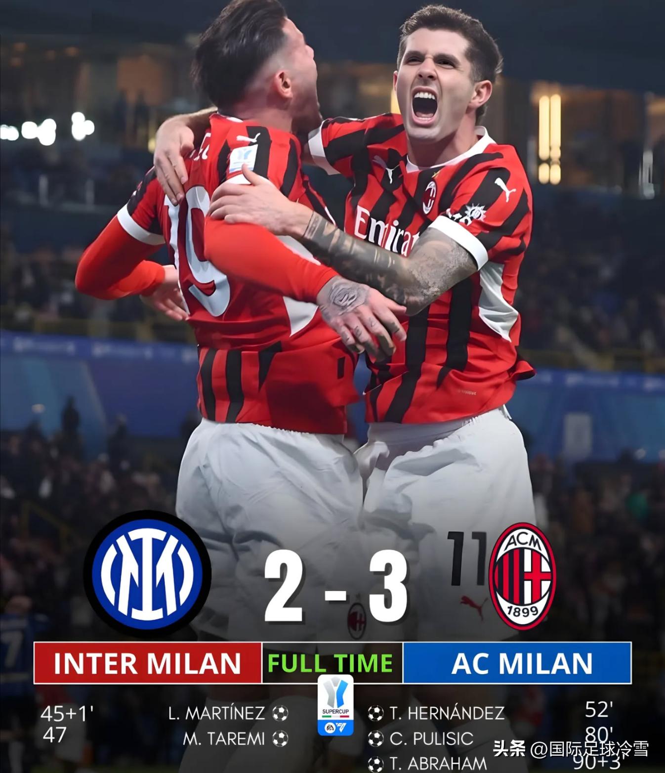 另一场是上赛季的意大利超级杯决赛,国米一度2-0领先米兰,但红黑军凭借特奥、普利西奇和亚伯拉罕的进球,3-2逆转夺冠。