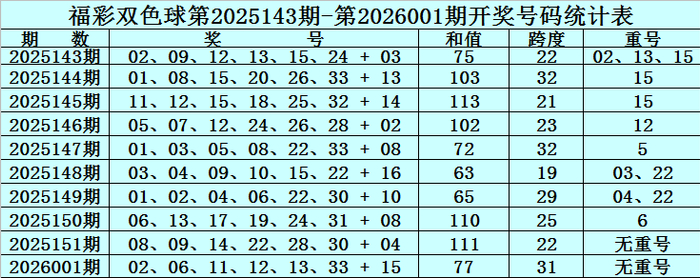 双色球第2026001期奖号开出:02、06、11、12、13、33 + 15,红球号码和值开出77,跨度开出31,开出重号0个:无重号。蓝球为0路号码。