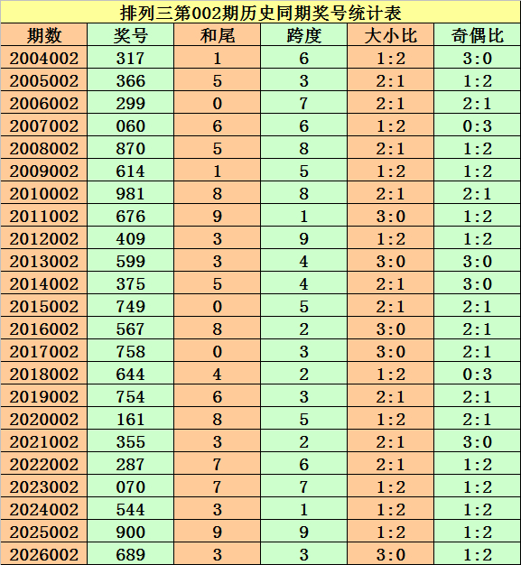 上期追想:胪列三第2026002期奖号开出689。