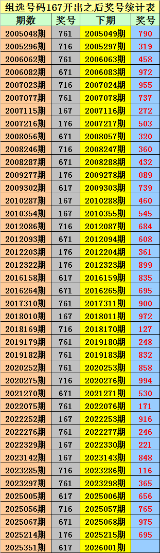 罗列三组选167出现之后下期辞别开出:790、319、458、972、955、737、272、503、320、360、432、089、739、460、545、684、608、361、899、835、695、900、972、127、248、832、858、994、530、171、916、246、221、848、116、365、656、765、975、695。