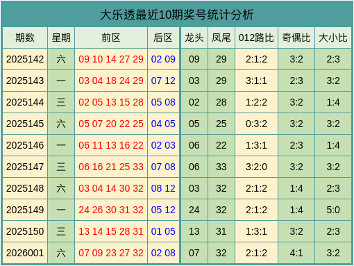 上期归来:大乐透第2026001期:前区07、09、23、27、32;后区02、08,其中前区012路比为2:1:2,奇偶比为4:1,后区开出偶数号码02、08。