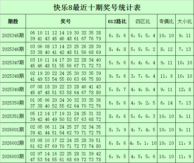 福彩中意8第2026003期开奖总结:02 07 14 16 22 25 28 31 39 42 47 53 54 55 61 68 69 72 73 78,其中奖号012路比为6:9:5,四区比为4:5:5:6,奇偶比为10:10,大小比为11:9。
