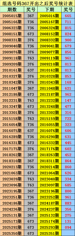 成列三组选367出现之后下期分袂开出:665、711、815、824、900、679、856、961、013、013、853、168、621、962、147、477、316、722、323、606、631、445、602、452、864、860、626、334、685、800、961、883、356、275、131、094。