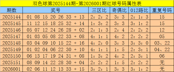 福彩双色球第2026001期奖号为:02 06 11 12 13 33 + 15,红球奇偶比为3:3,三区比为3:2:1,012路比为3:1:2,重号:无。