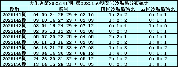 体彩大乐透第25150期奖号为:13 14 15 28 31+01 05,前区奖号奇偶比为3:2,012路比为1:3:1,大小比为2:3,遗漏总值为14,后区号码遗漏总值为10。