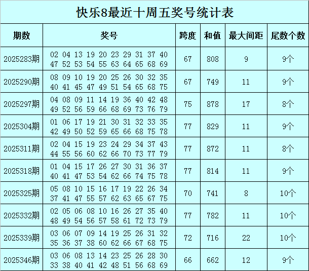 福彩爽脆8第2025346期(上周五)记忆:03 06 08 13 14 23 25 26 28 30 33 38 40 41 42 48 51 56 68 69,其中奖号首尾间距为66,和值为662,最大间距为12,余数散播为:余数7包含0个号码,余数2、4、5、9包含1个号码,余数0、1包含2个号码,余数6包含3个号码,余数3包含4个号码,余数8包含5个号码。