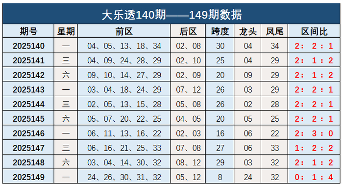 大乐透第2025149期出奖号统计:前区24、26、30、31、32,后区05、12。前区跨度8,龙头24,凤尾32,区间比比0:1:4。