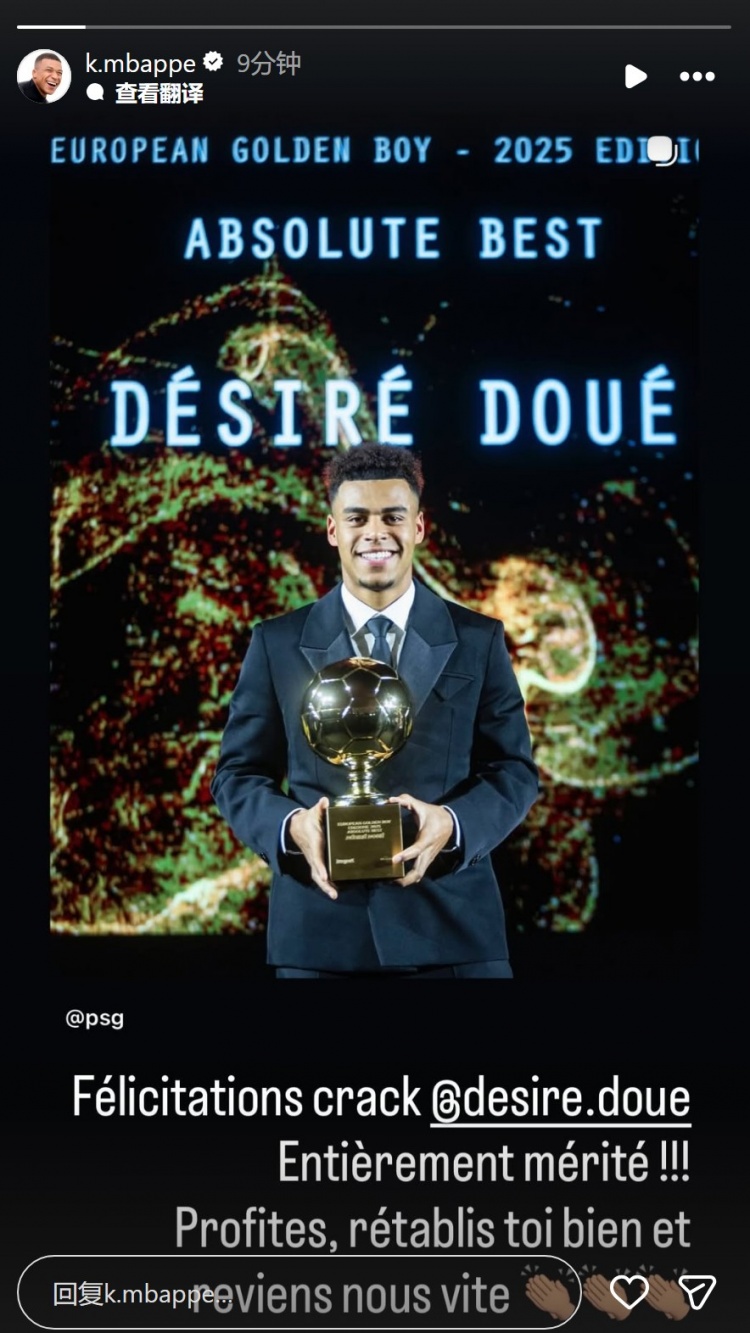 姆巴佩社媒晒出杜埃领奖的照片,配文:“祝贺你,天才!实至名归!尽情享受这一刻,尽快康复,早日归来!”