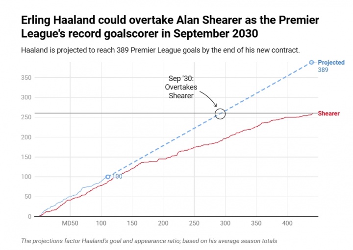 如果哈兰德能保持目前的良好状态,直到他九年半合同结束,他最终将达到389球——比希勒多129球。