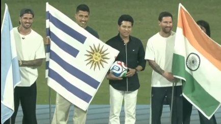 活动中,德保罗手持阿根廷国旗,苏亚雷斯手持乌拉圭国旗,梅西手持印度国旗,三人与现场嘉宾一同合影留念。